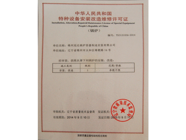 特種設備安裝改造維修許可證(鍋爐)
